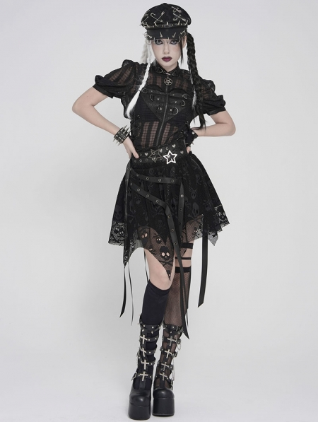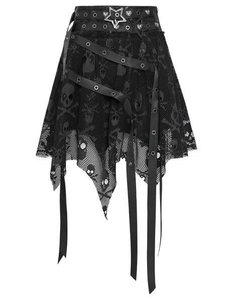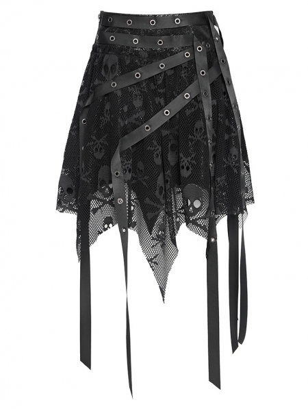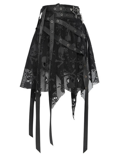 Black Gothic Skull Mesh Asymmetric Eyelet Strap Punk Skirt