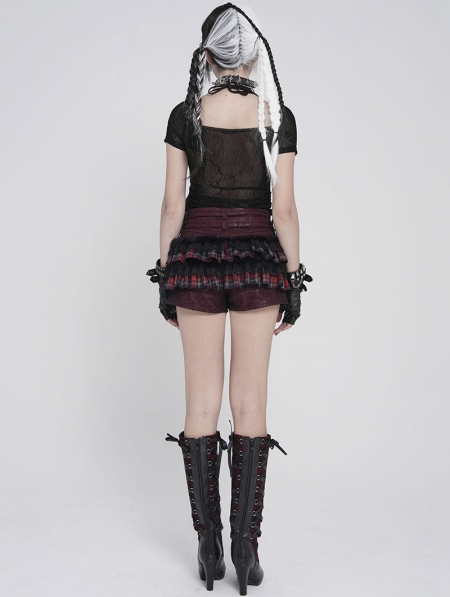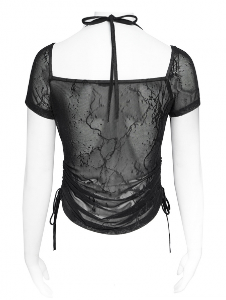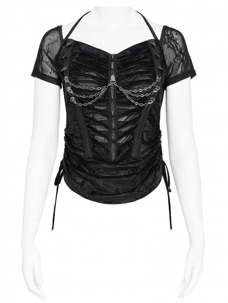 Black Gothic Punk Rivet Ruched Drawstring T-shirt for Women