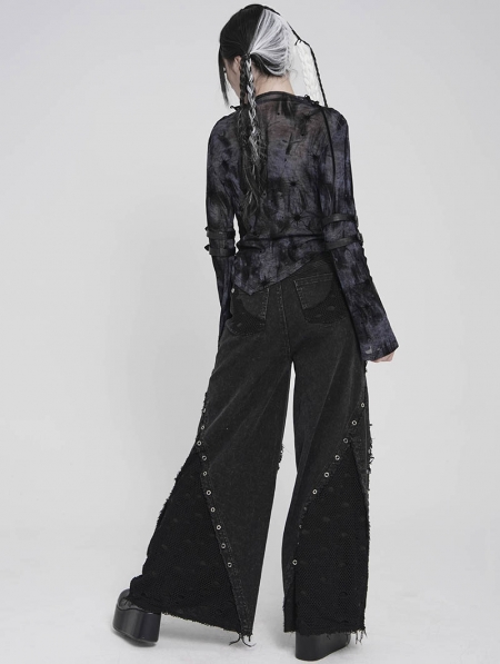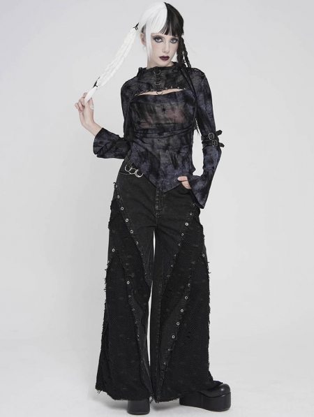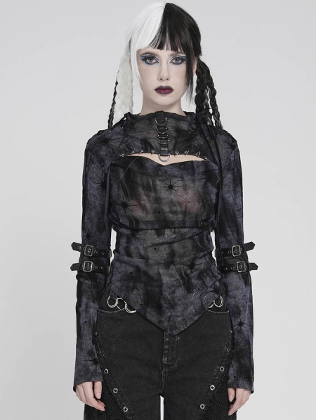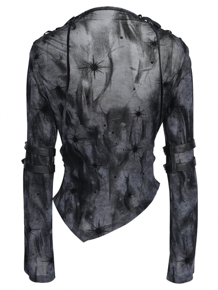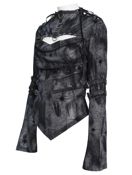 Black Gothic Cut Out Ruched Long Sleeve T-Shirt for Women