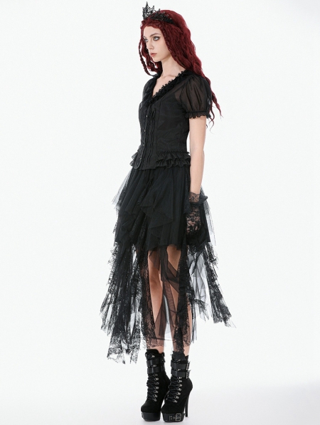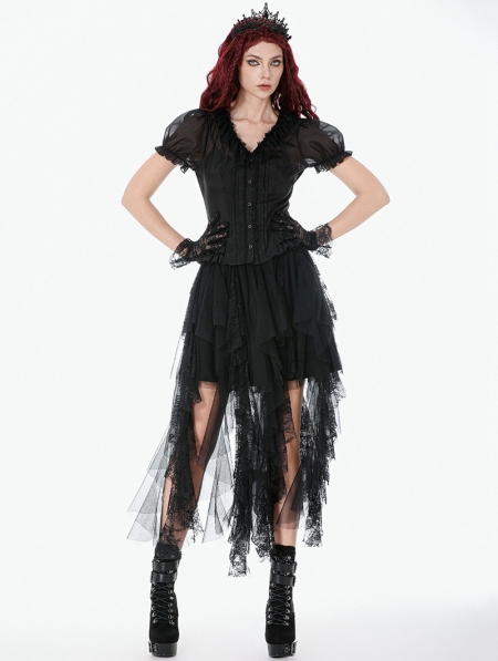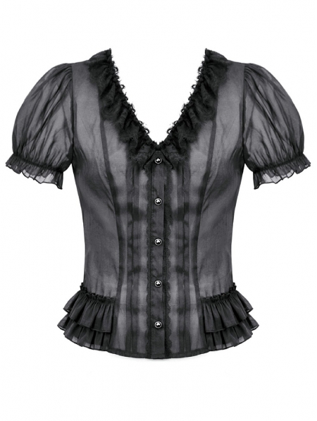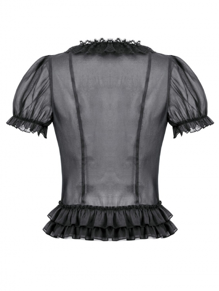 Black Gothic Sheer Ruffle Puff Sleeve Blouse for Women