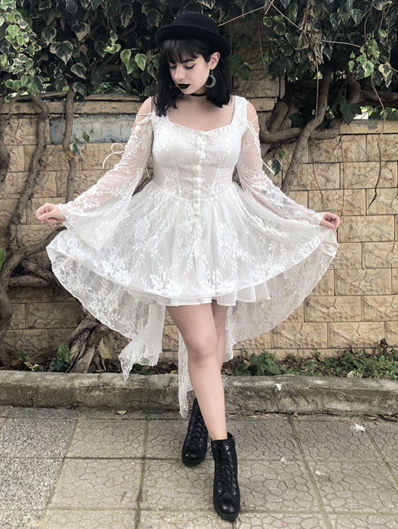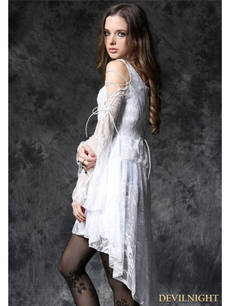 White Off-the-Shoulder Long Sleeves High-Low Lace Gothic Dress