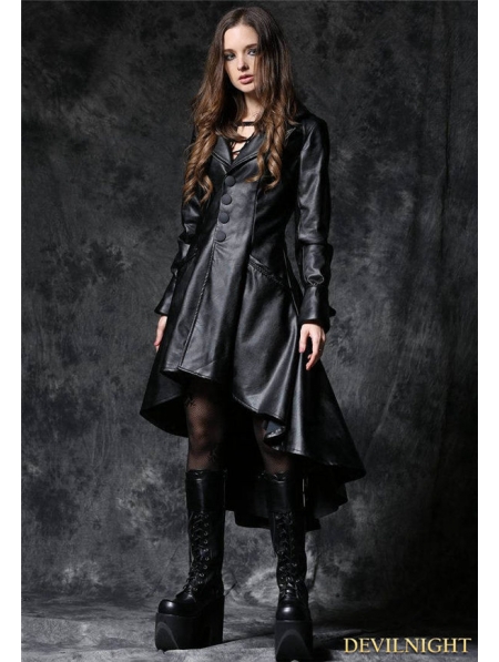 Black Gothic Leather Dovetail Robe Jacket with Eyelets Cap
