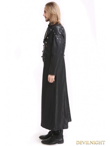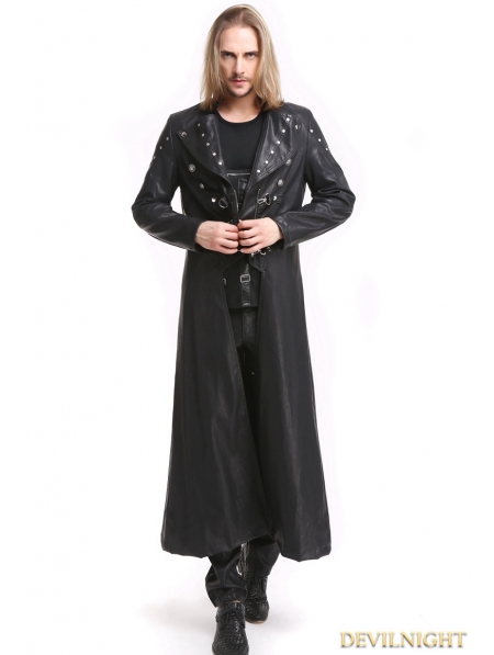 Black PU Leather Gothic Punk Military Style Long Trench Coat for Men