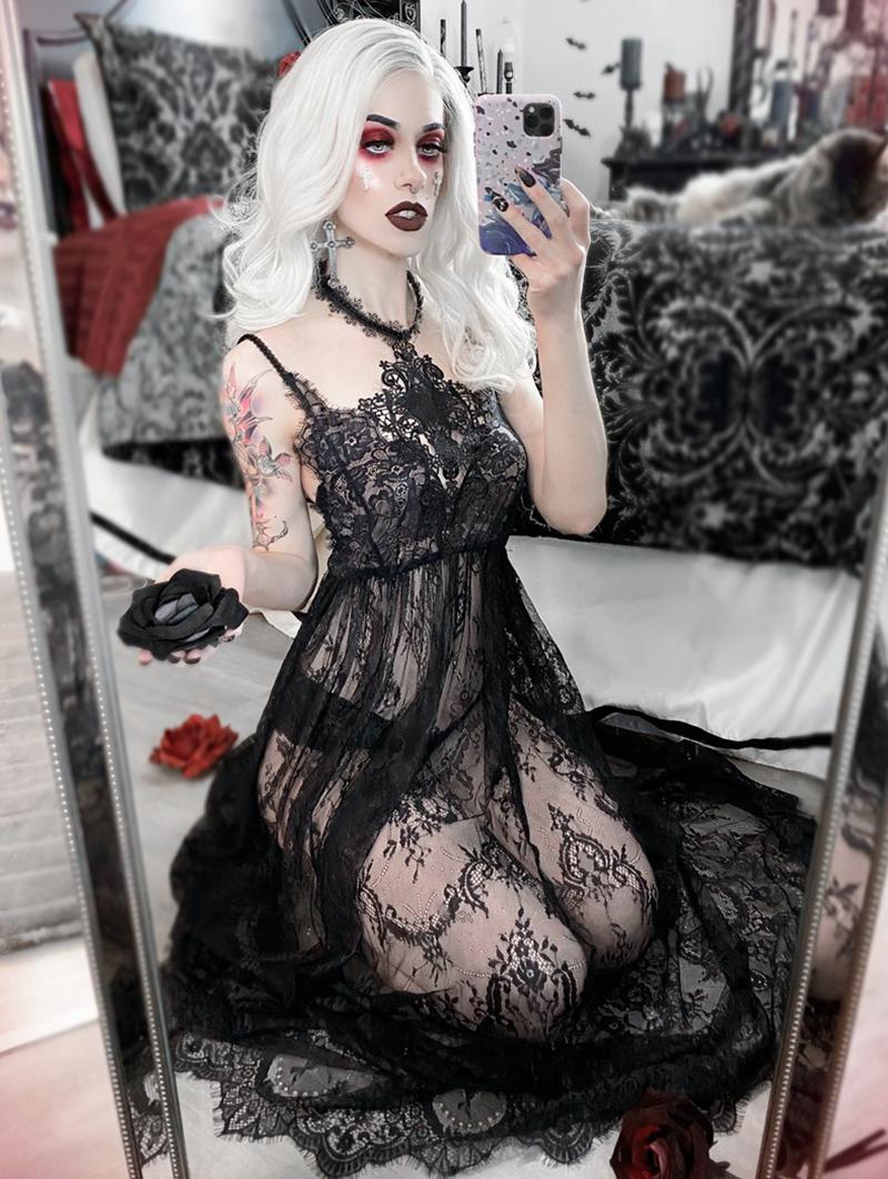 Black Romantic Sexy Gothic Lace Long Sheer Dress
