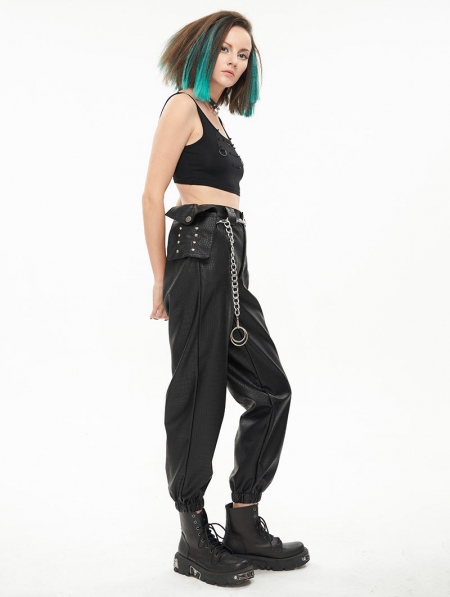 Black Gothic Punk PU Leather Daily Wear Long Cargo Pants for Women
