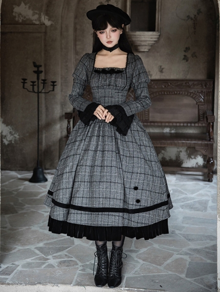 Gray and Black Vintage Plaid Pattern Gothic Lolita OP Dress