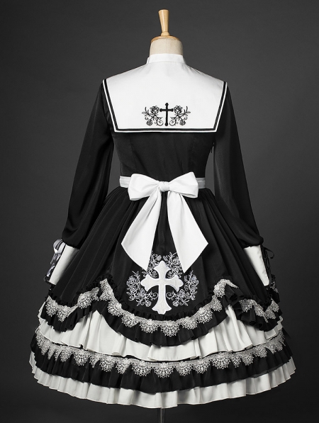 Eternal Night Black and White Cross Long Lantern Sleeve Gothic Lolita OP Dress