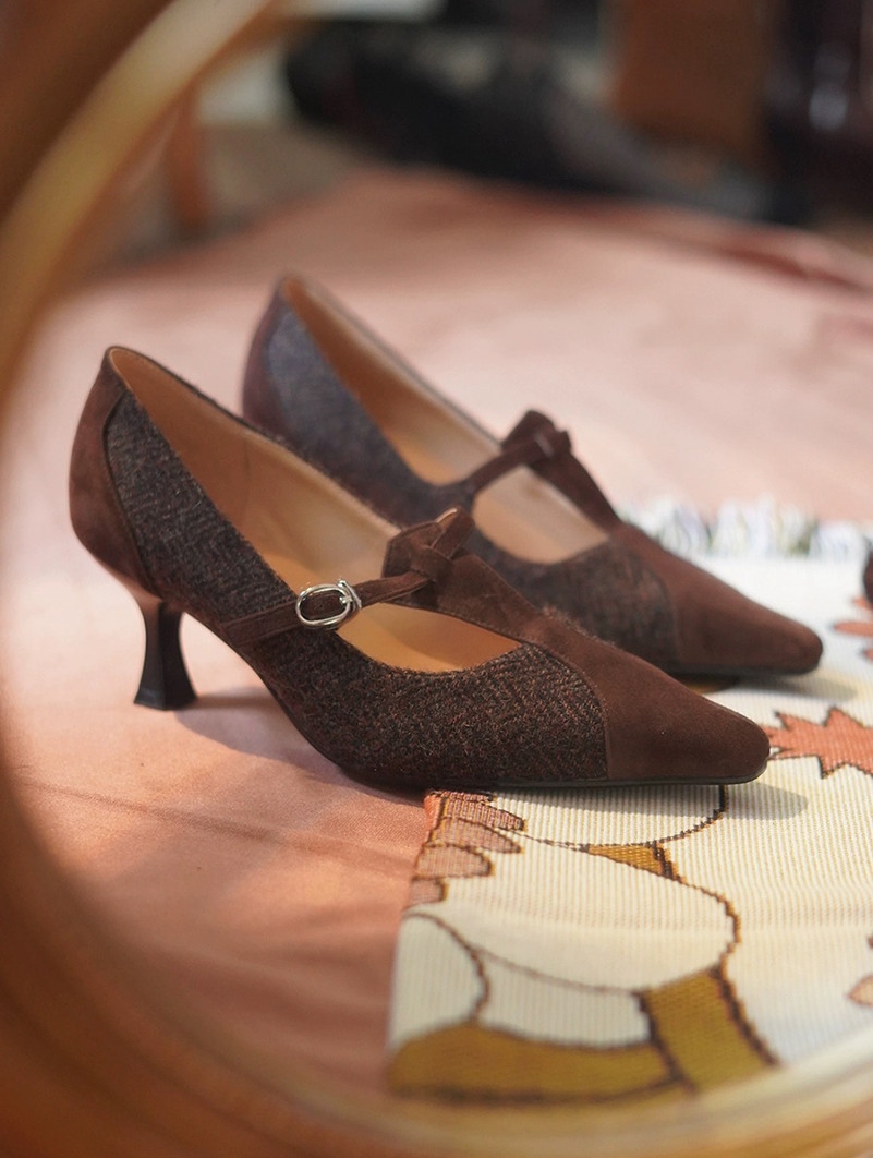 Brown Wool Leather Splicing Vintage Pointed Stiletto Heel Victorian Shoes