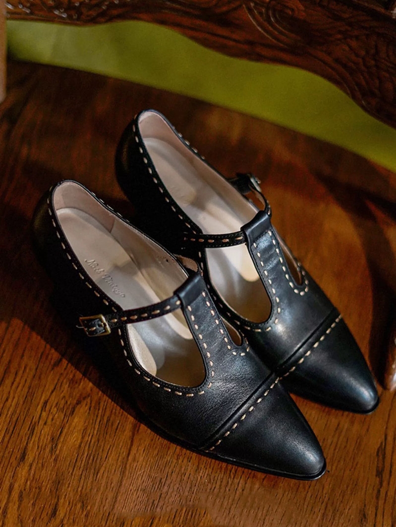 Black Retro Pointed Toe T-Strap Chunky Heel Victorian Shoes