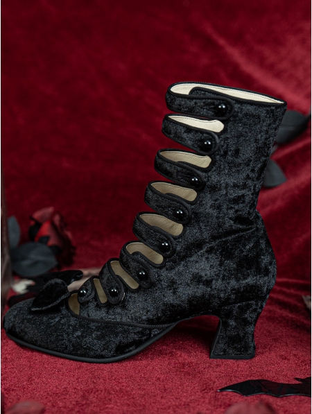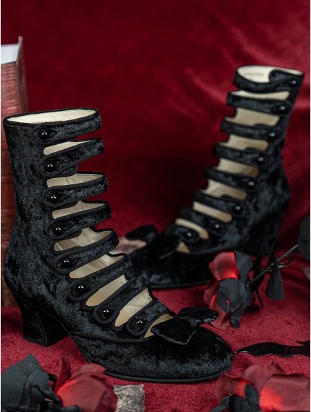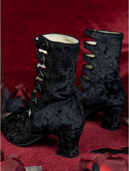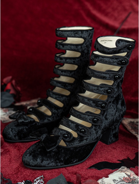 Black Cutout Chunky Heel Victorian Boots with Bow