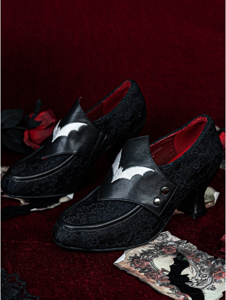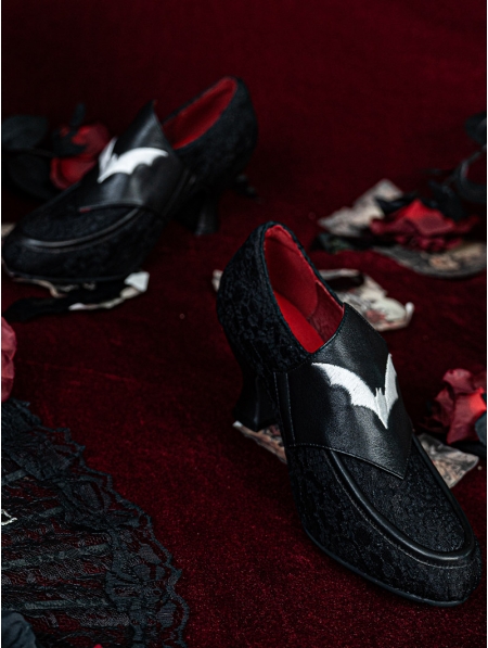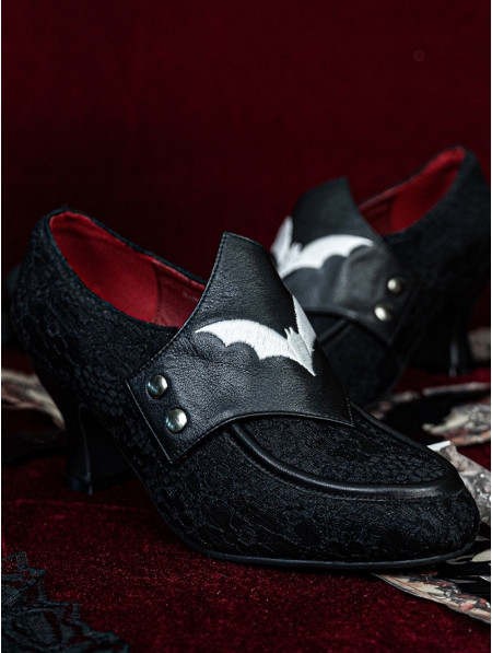 Black Victorian Gothic Bat Wing Flap Lace Spliced Leather Shoes